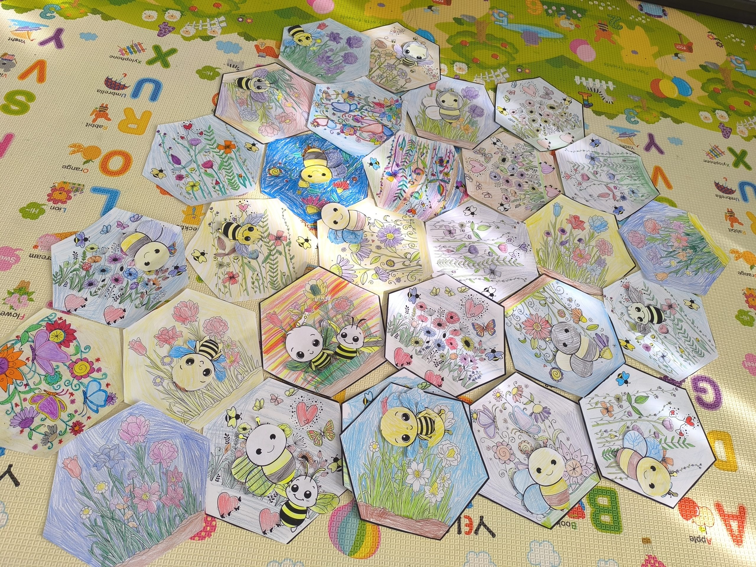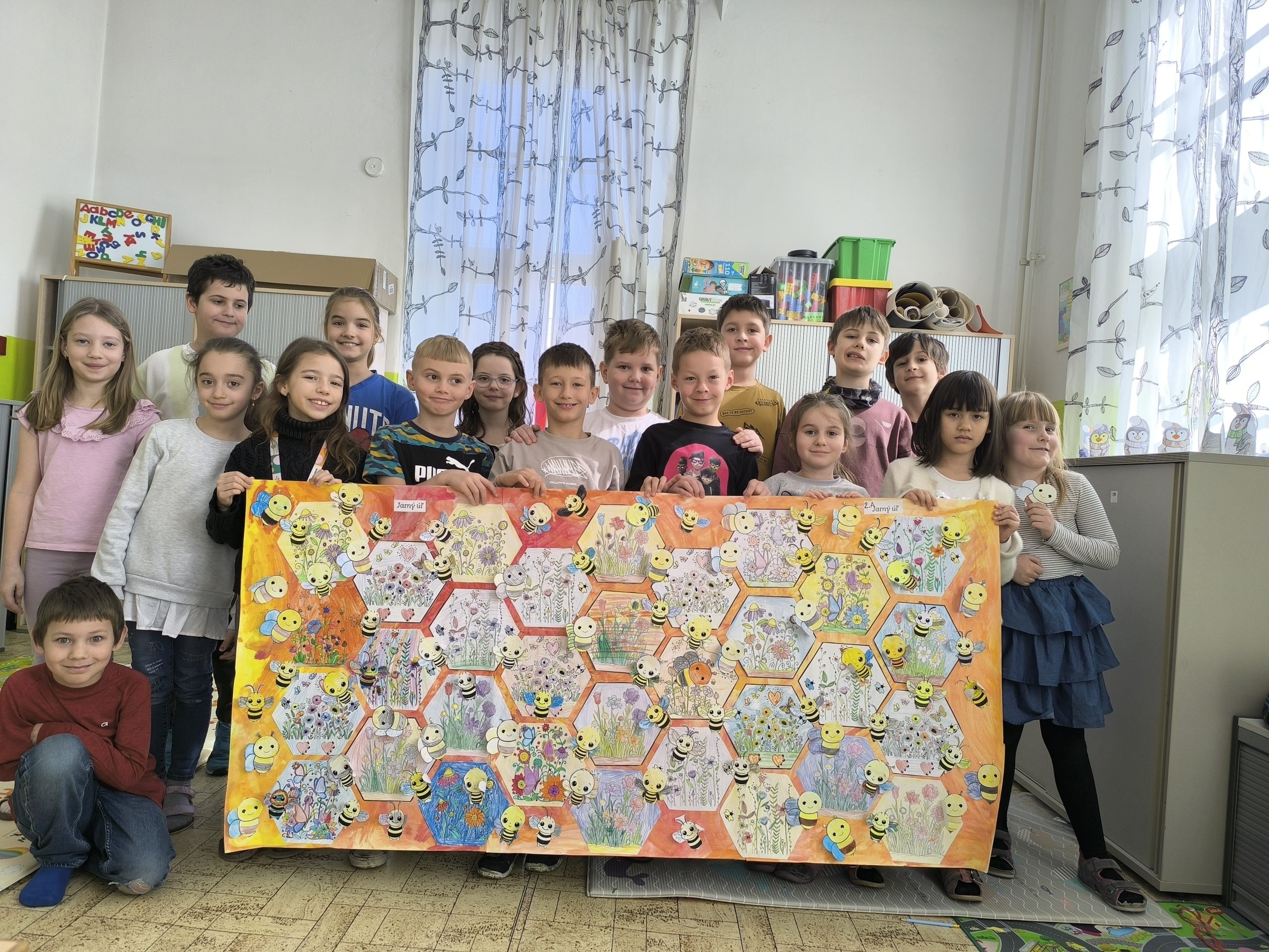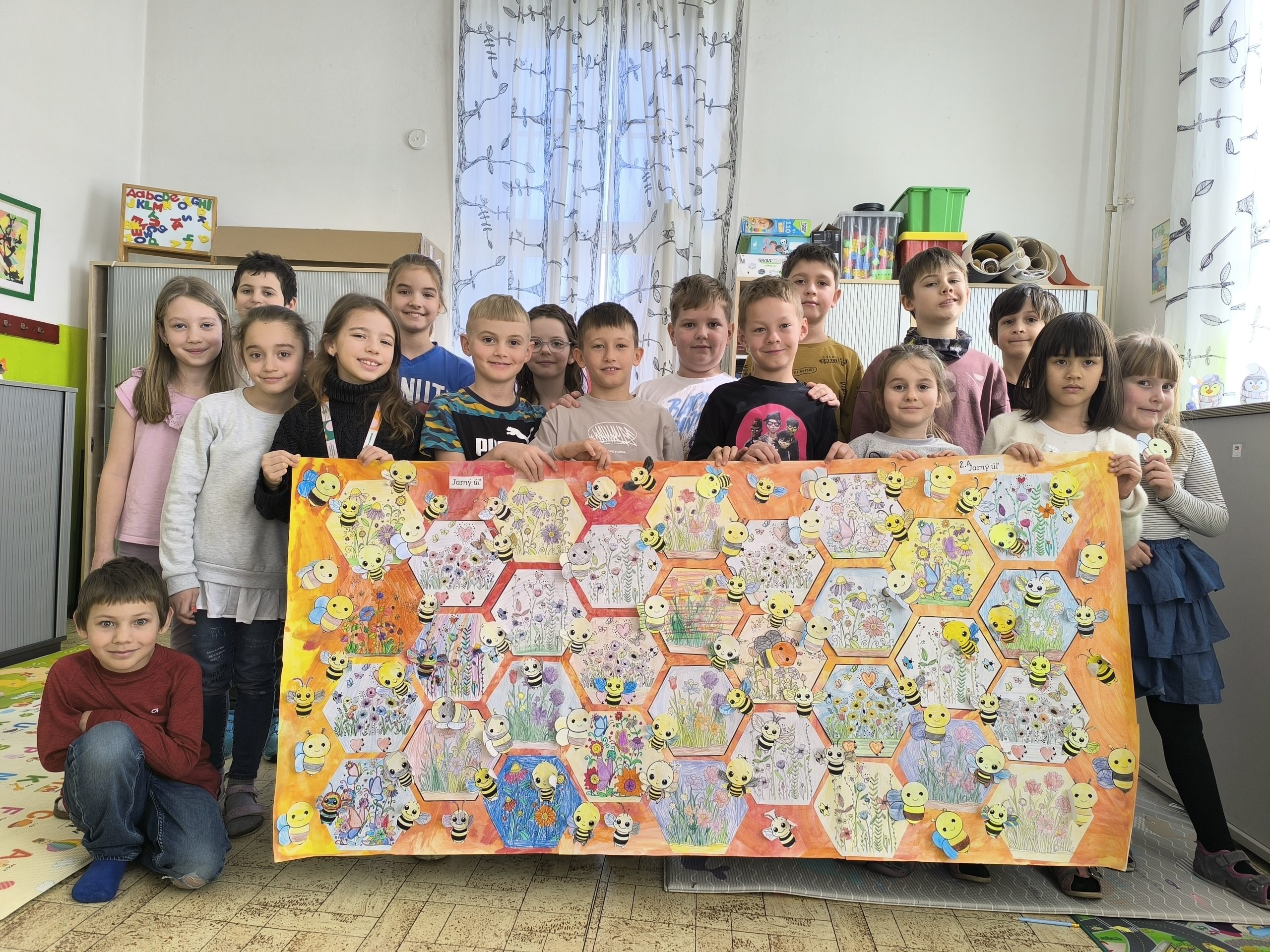 Na druhý deň si deti spoločne na výtvarnej výchove vyrobili vlastný jarný úľ, ktorý hýri farbami a najlepšie na ňom je, že vznikol ako produkt tímovej práce všetkých detí.