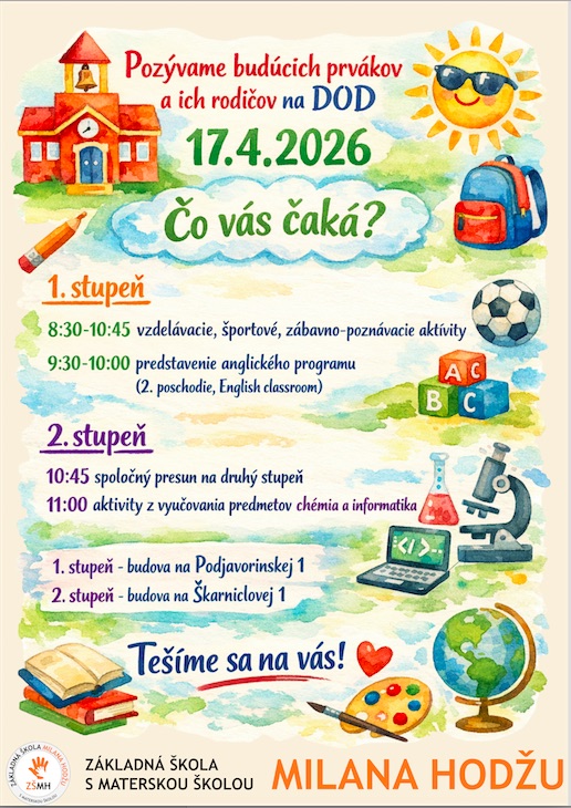 Srdečne pozývame budúcich prvákov a ich rodičov na Deň otvorených dverí, ktorý sa uskutoční dňa 17. apríla 2026 v priestoroch našej základnej školy.