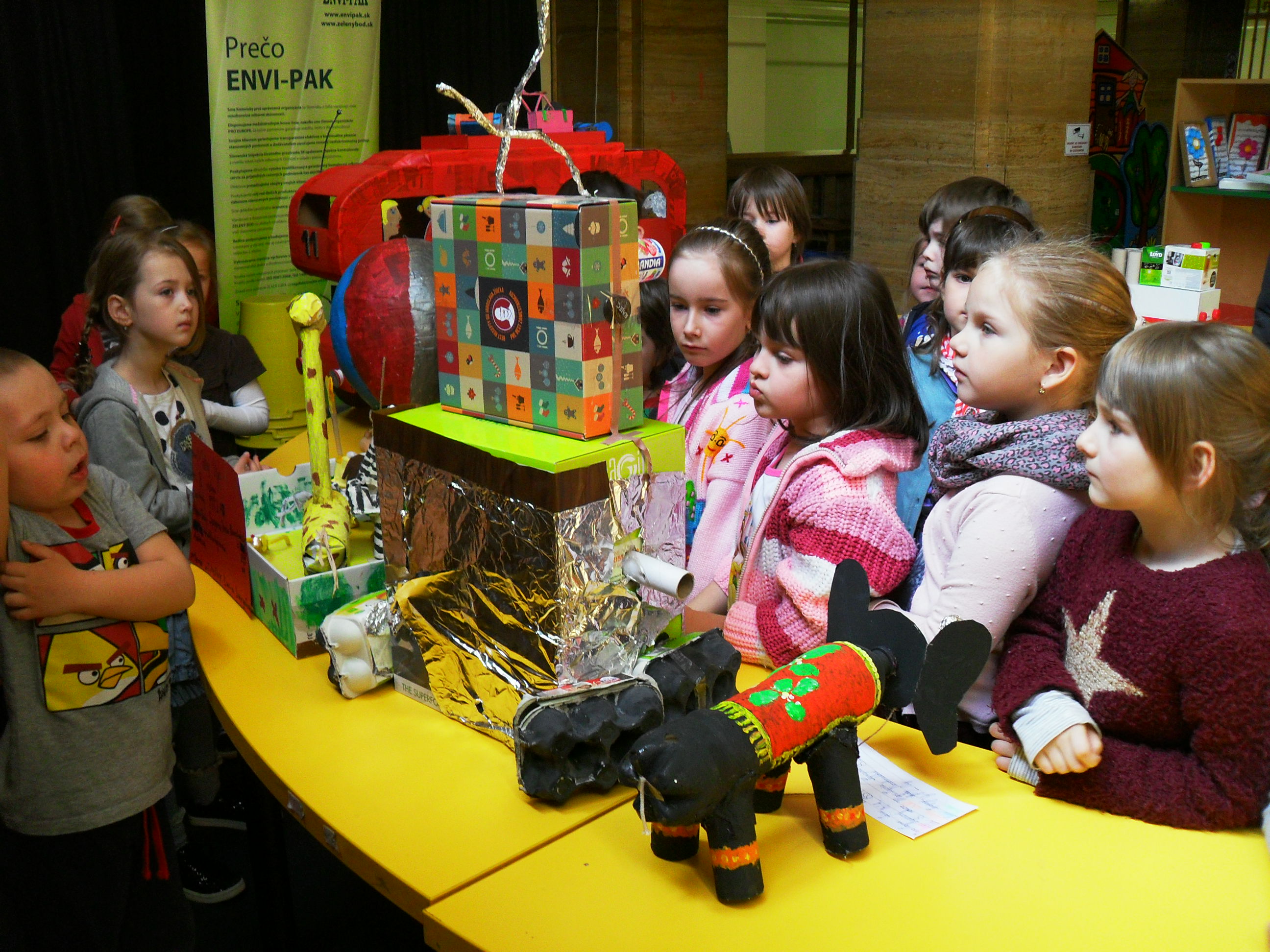 V týždni od 20. apríla do 24. apríla sme sa venovali výrobe rôznych krásnych predmetov z odpadového materiálu a pre rodičov sme z nich urobili výstavu.