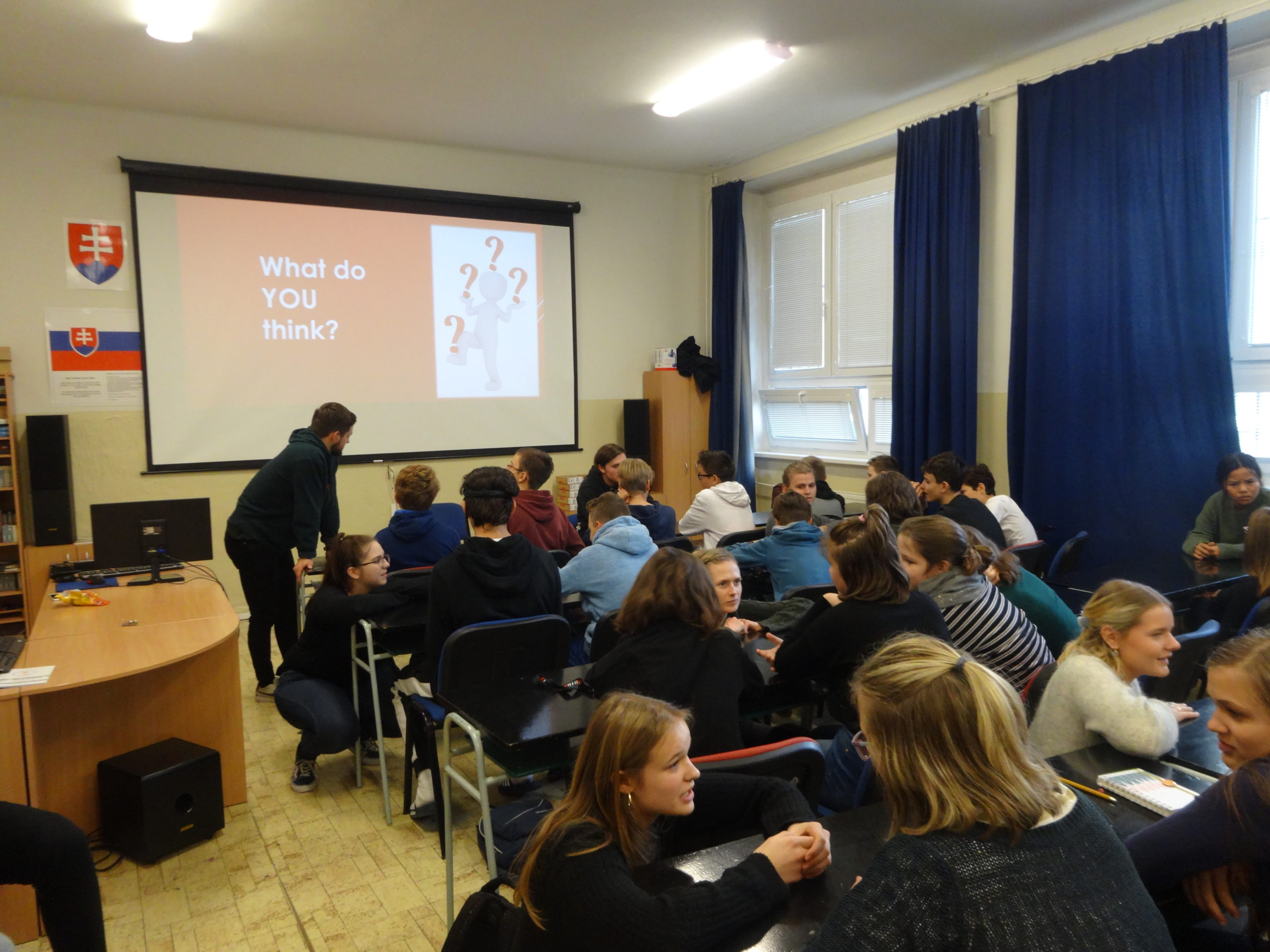 Deviataci a ôsmaci sa zúčastnili na interaktívnej prezentácii o Dánsku, ktorú viedli študenti z tejto severskej krajiny. Okrem zaujímavých informácií o Dánskom kráľovstve mohli žiaci diskutovať o téme osamelosti, ale aj zasúťažiť si o tradičné cukrovinky „Liquorice“. Zúčastnené triedy predviedli výbornú úroveň angličtiny.