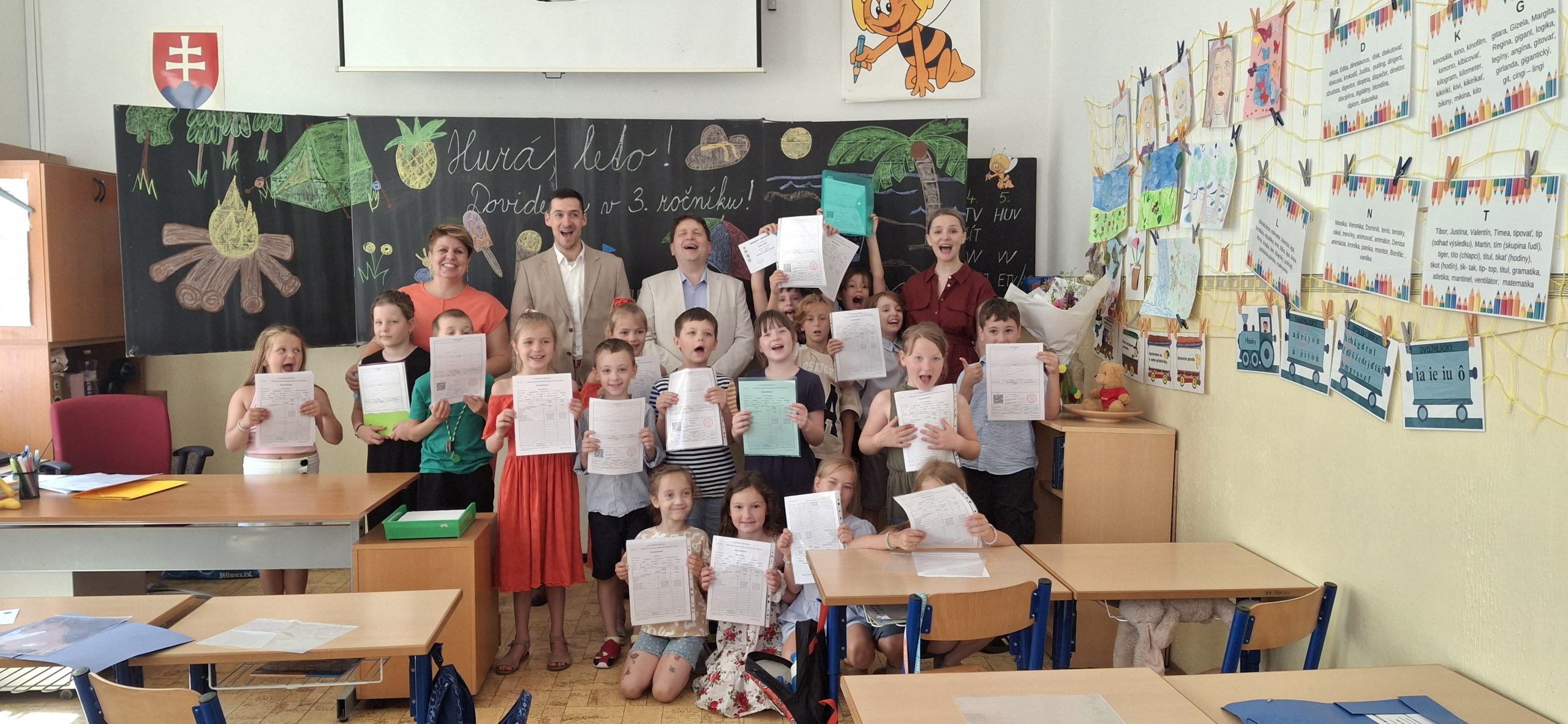 Okrem srdečného stretnutia so žiakmi a pedagógmi prvého stupňa a prechádzky zákutiami nášho školského dvora stihol pán starosta odovzdať vysvedčenia druhákom a absolvovať nespočetné množstvo milých rozhovoroch so žiakmi 1. – 4. ročníka. Tí nelenili a okrem vysvedčenia sa pochválili aj pestrými prázdninovými plánmi.