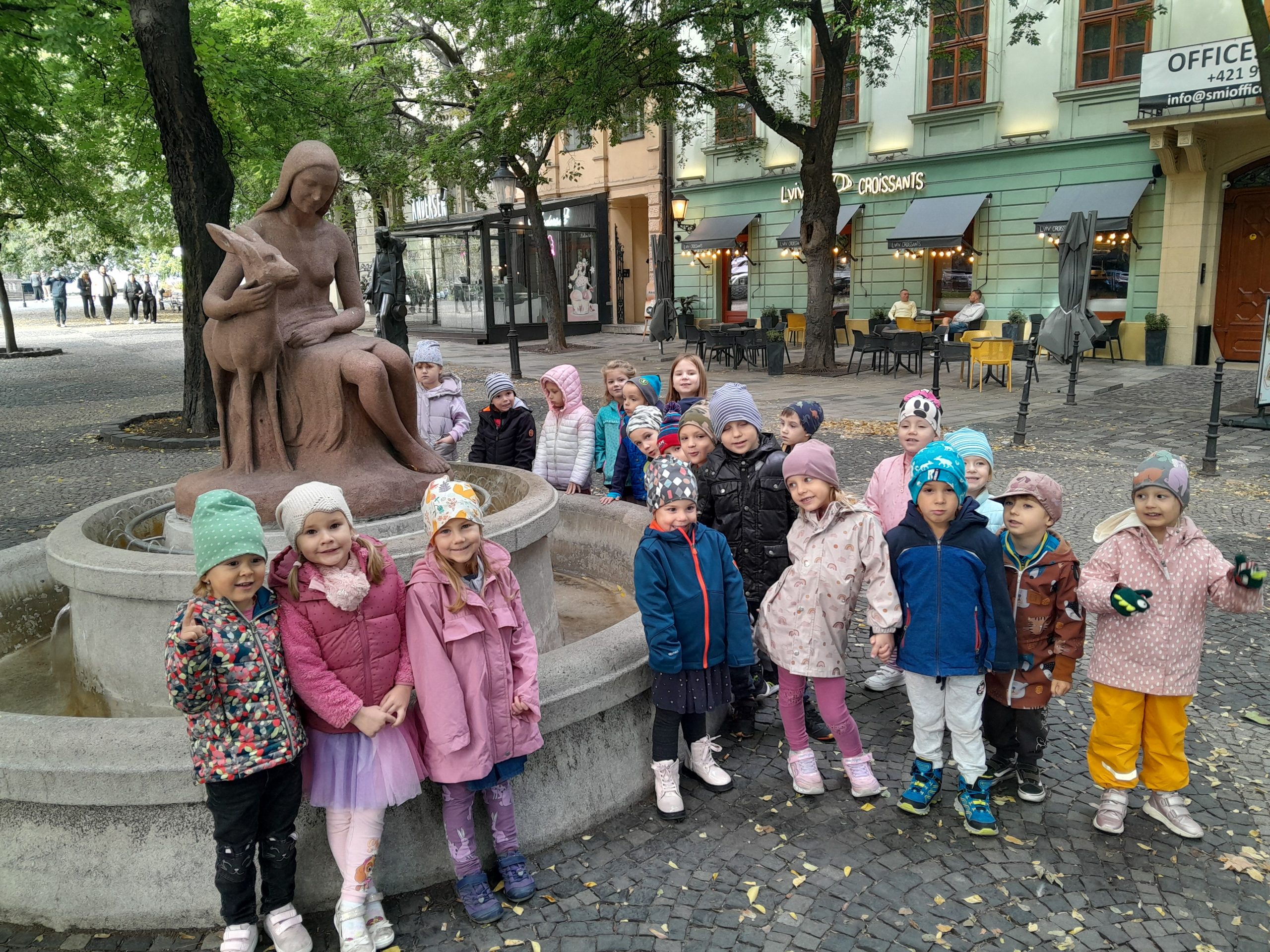 Slniečko, aj keď zubaté, svietilo už od rána. Nezostávalo iné, len sa posilniť dobrou desiatou, poriadne sa obliecť a vybrať sa na špacírku do našej mestskej časti. Tentoraz sa z nás stali turisti a naším cieľom bolo spoznať niektoré z fontán Starého Mesta. Na prvej zo série týchto vychádzok naše kroky viedli ku Ganymedovej a Rolandovej fontáne, ako aj k Fontáne dievčaťa so srnkou. A o tom, že sa nám tento výlet páčil, hovorila nadšená vrava, či už počas presunu do našej materskej školy, alebo v tematickom rozhovore po našom návrate.