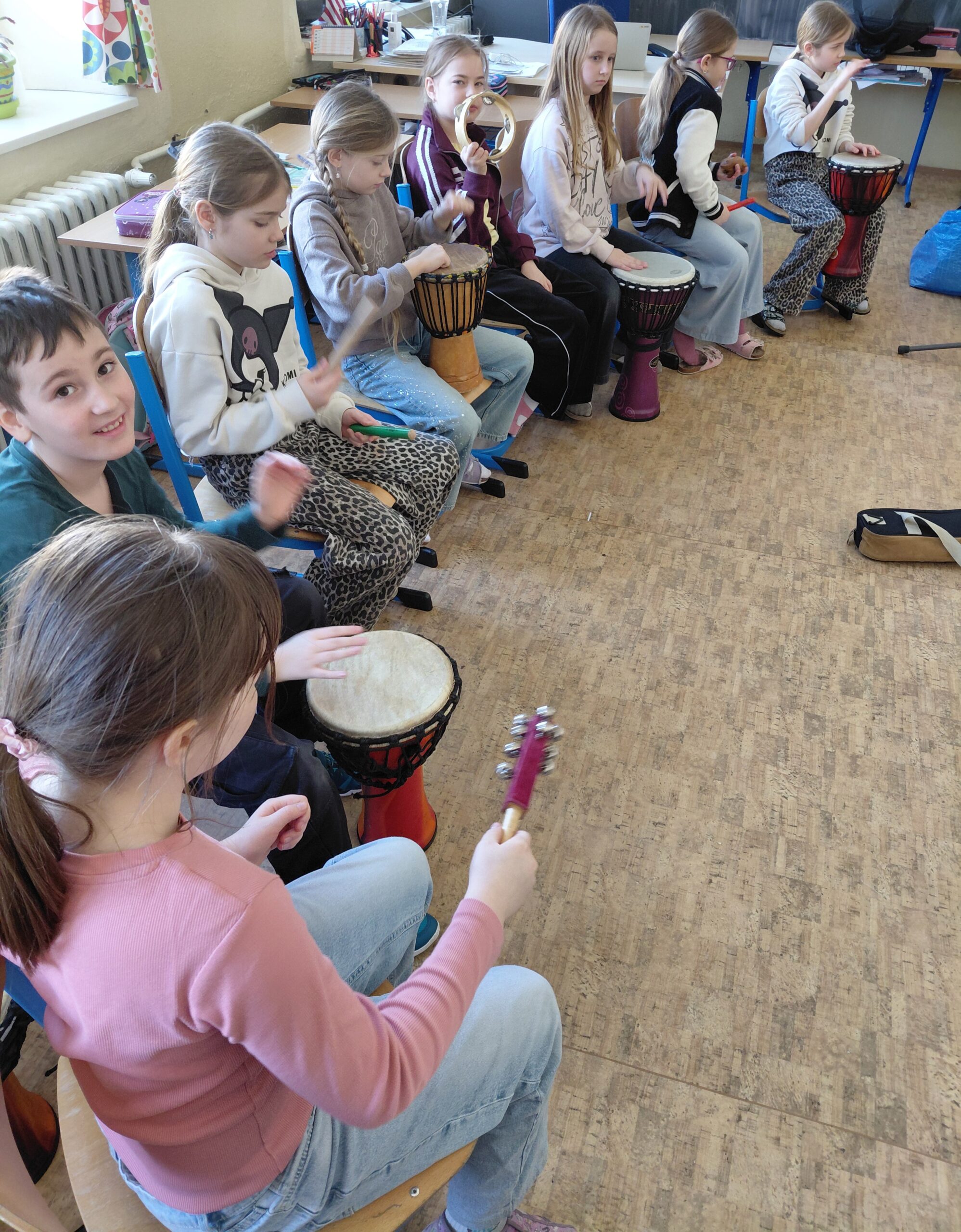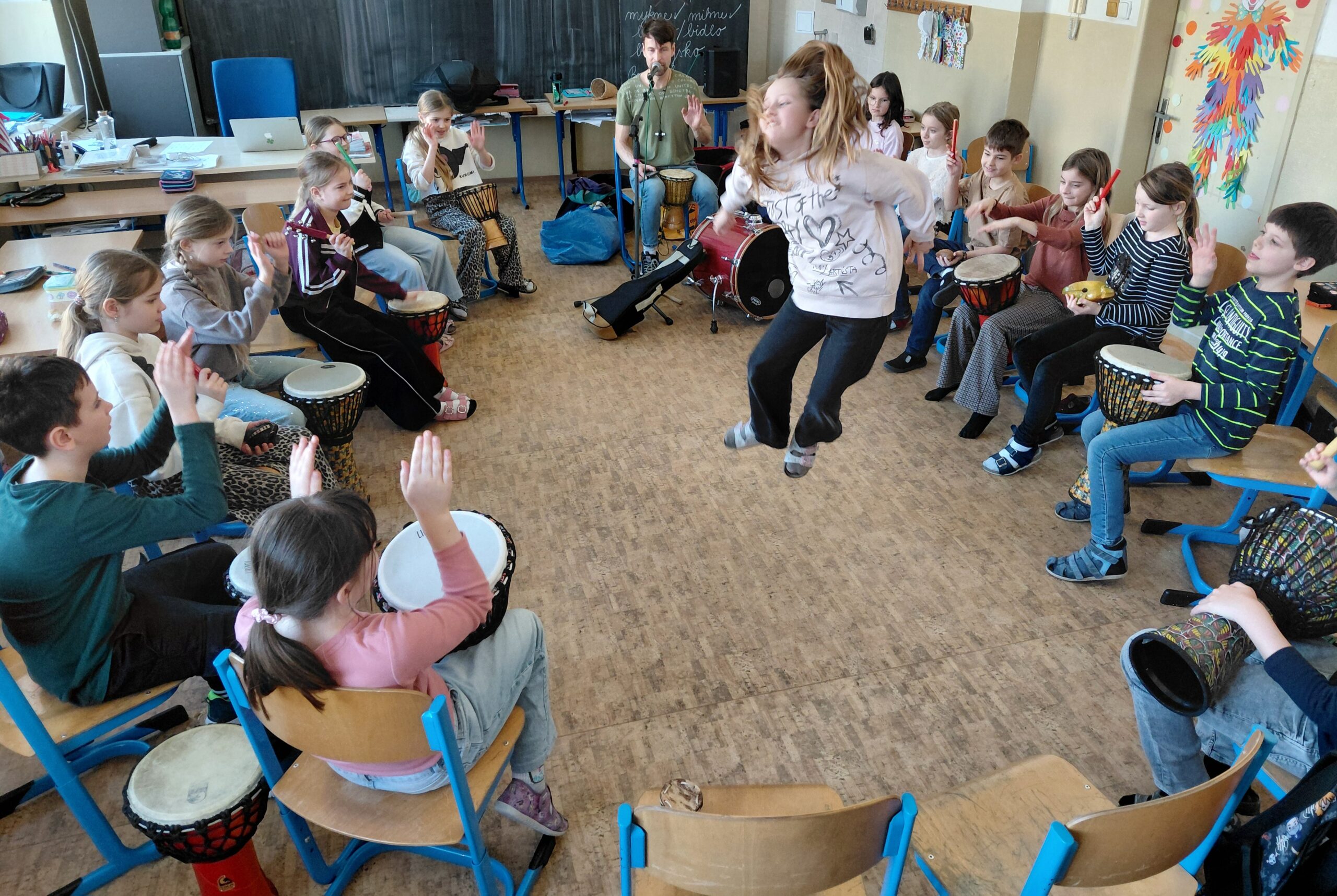 Žiaci z 3. B na chvíľu vymenili zošity a perá za bubny a paličky. Skúsený hudobník deťom predstavil fascinujúci svet rytmu a so sebou priniesol celú zbierku nástrojov. Pod jeho vedením sa trieda zmenila na jeden veľký školský orchester.
