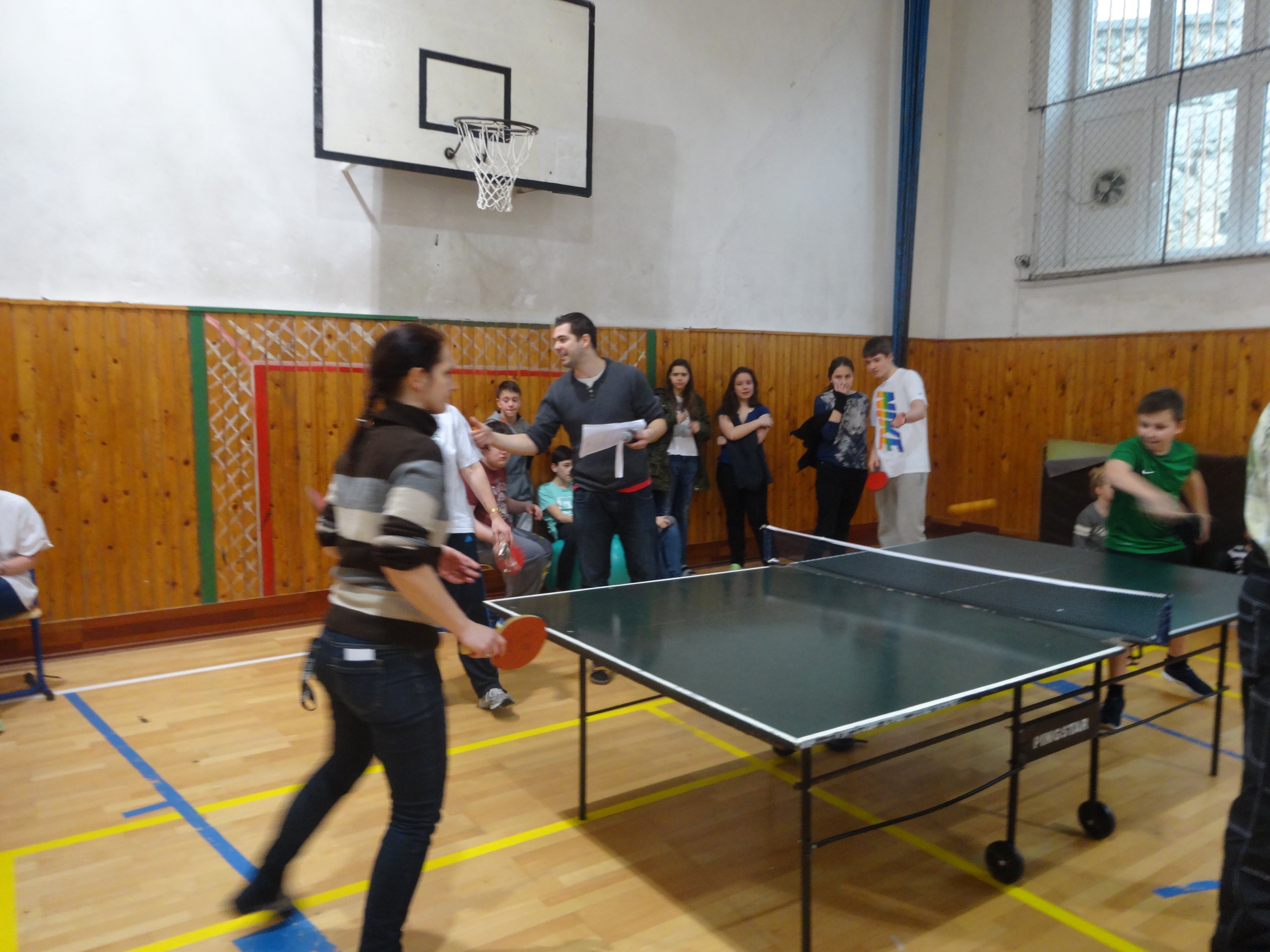 No, ako to býva, do posledných bojov nemôže zasiahnuť každý, a preto sa o medaily bili najlepší z najlepších. Za učiteľov to bol pán učiteľ Ferko a pán učiteľ Penkala. Pani učiteľka Krajčová veľmi dobre hájila farby učiteľského zboru, úspešne sa v zápasoch ku slovu dostávala aj pani učiteľka Lichá a pani učiteľka Kanková. Pani učiteľka Beitlová odrážala úspešne útoky žiackych forhendov a pani učiteľka Töröková s pani učiteľkou Krištofičovou získavali body pre tím učiteľov. Pán učiteľ Šimkanin skončil vo svojej skupine za učiteľov na prvom mieste, a tak žiaci mali pred sebou nielen výzvu vo forme svojich učiteľov, ale aj obstojných protivníkov.