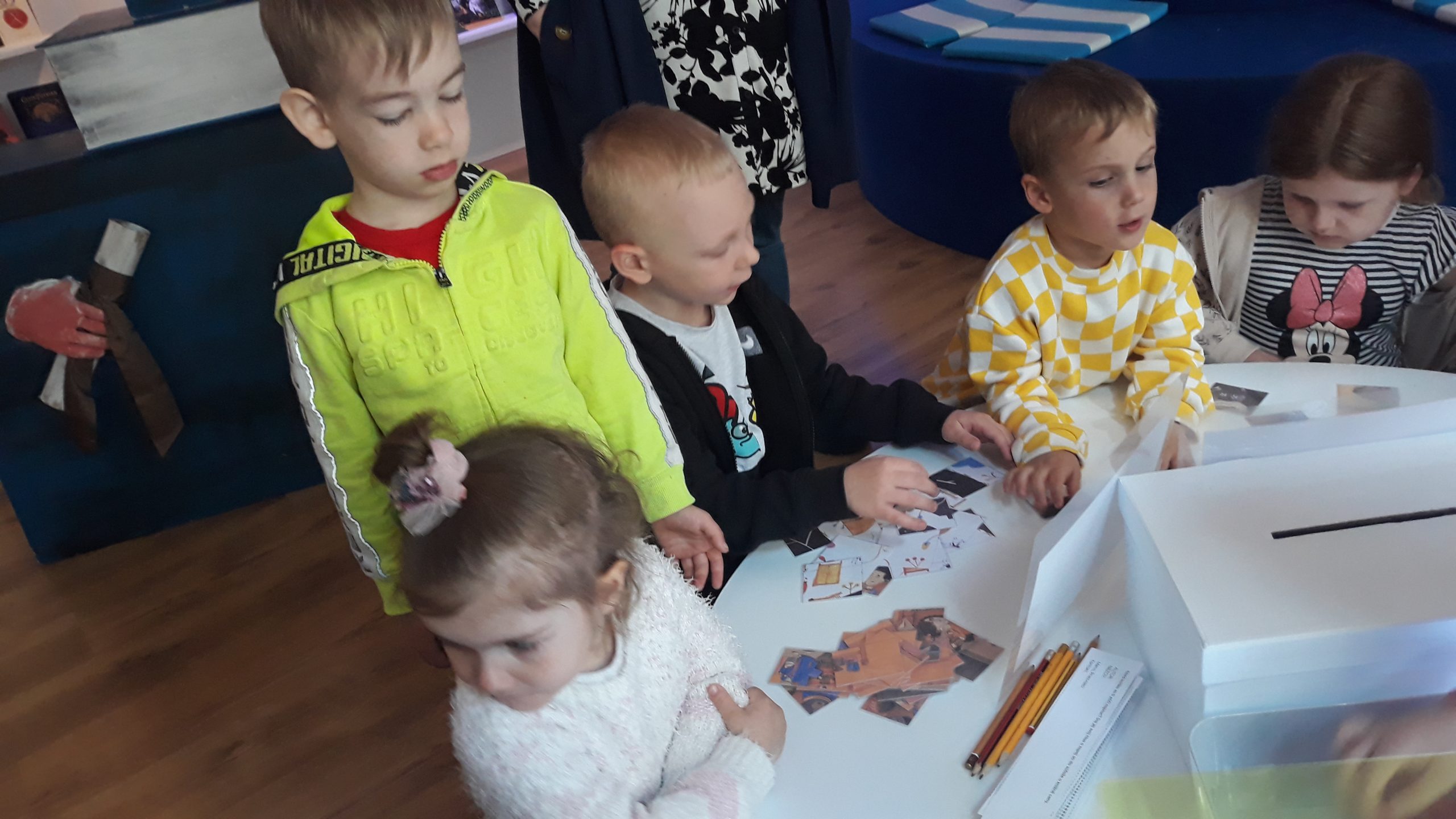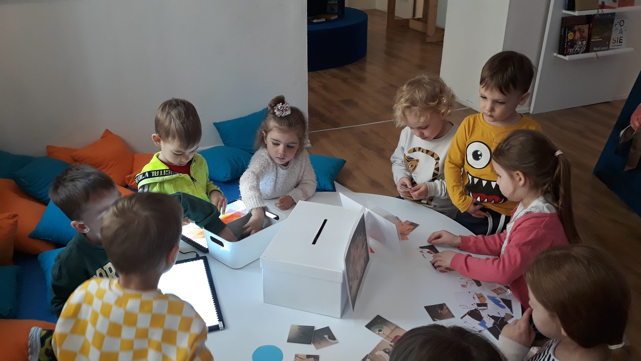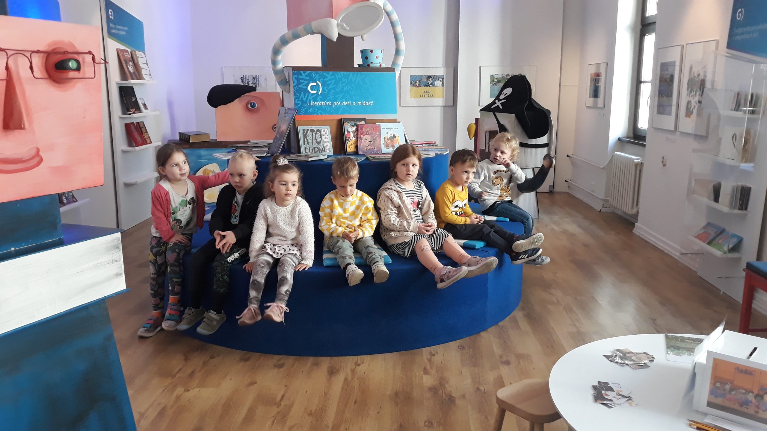 V máji naše Žabky navštívili interaktívnu výstavu s názvom Najkrajšie knihy Slovenska v staromestskej Bibiane. S lektorkou výstavy riešili viaceré úlohy.  Podľa obrázkov vyhľadávali knihy, skladali rozprávkové puzzle a pomocou tabletu vytvárali vlastný rozprávkový príbeh.